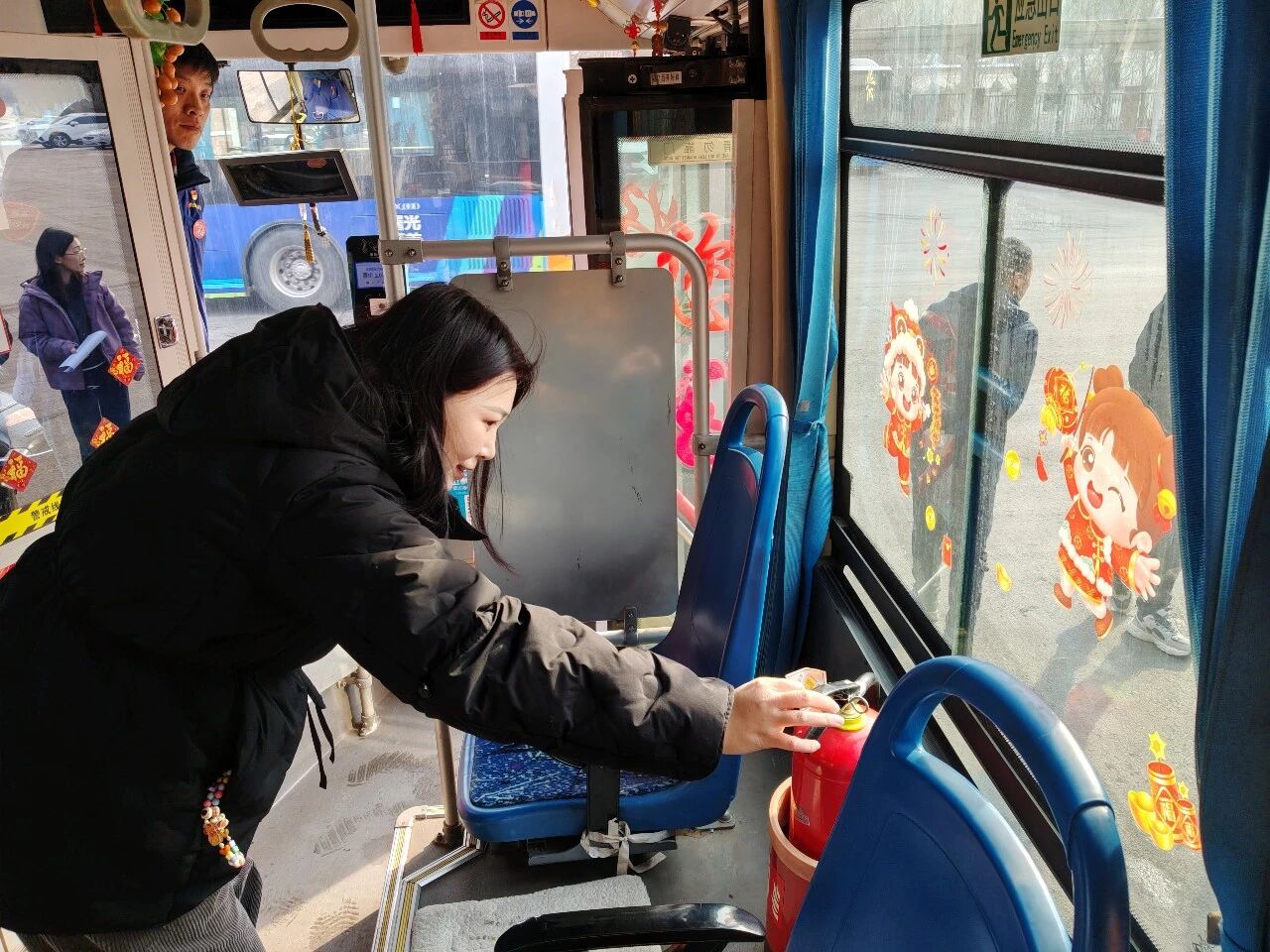 各車隊(duì)還在車廂內(nèi)懸掛紅燈籠、窗花等傳統(tǒng)裝飾。特別是271路駕駛員、書畫愛好者唐德忠揮毫?xí)鴮憽案!弊峙c春聯(lián),筆墨飄香之間,車廂內(nèi)外洋溢著濃濃年味,也傳遞著公交人對(duì)乘客真摯的新春祝福。