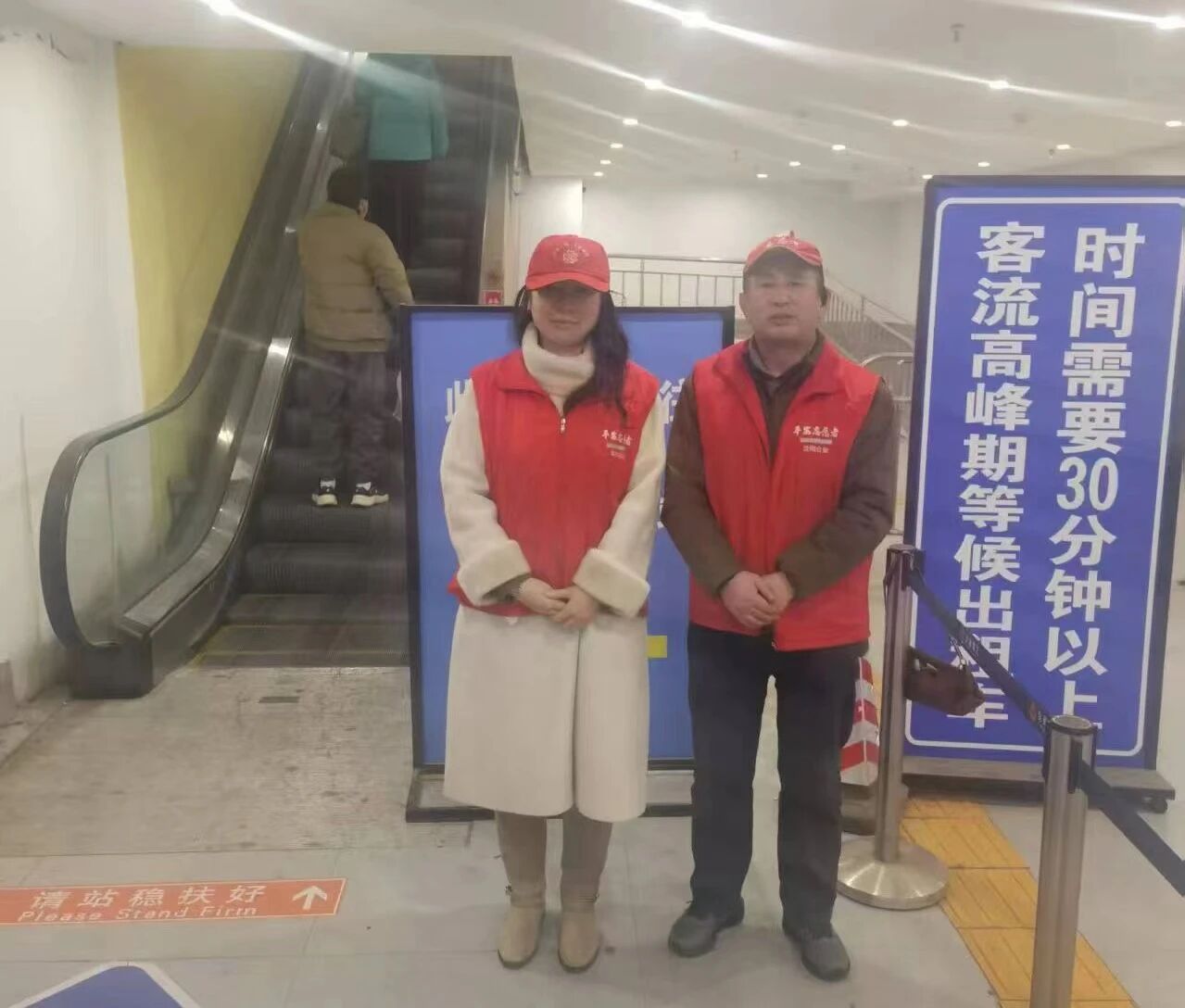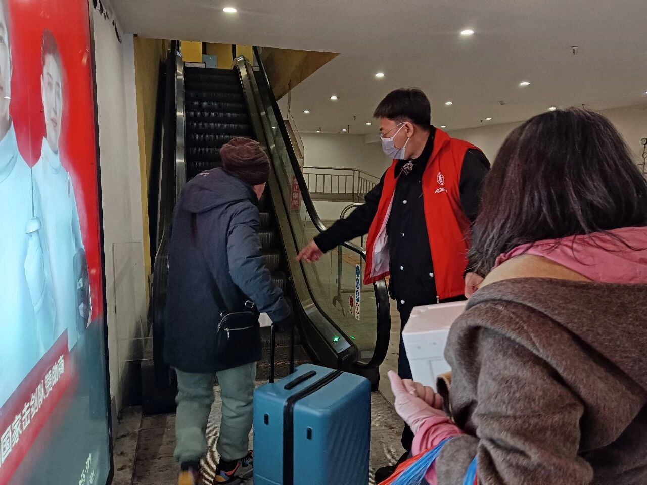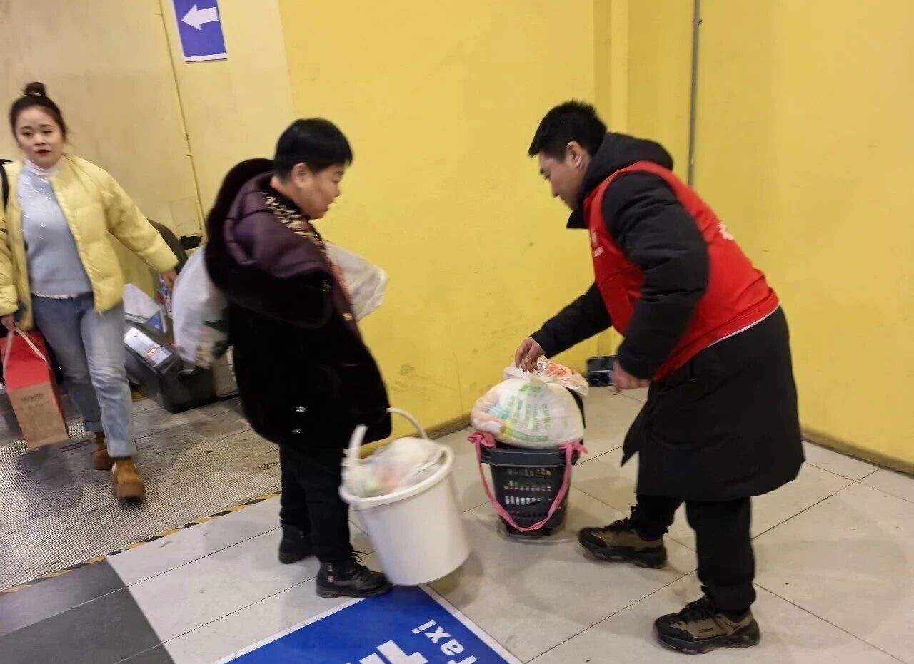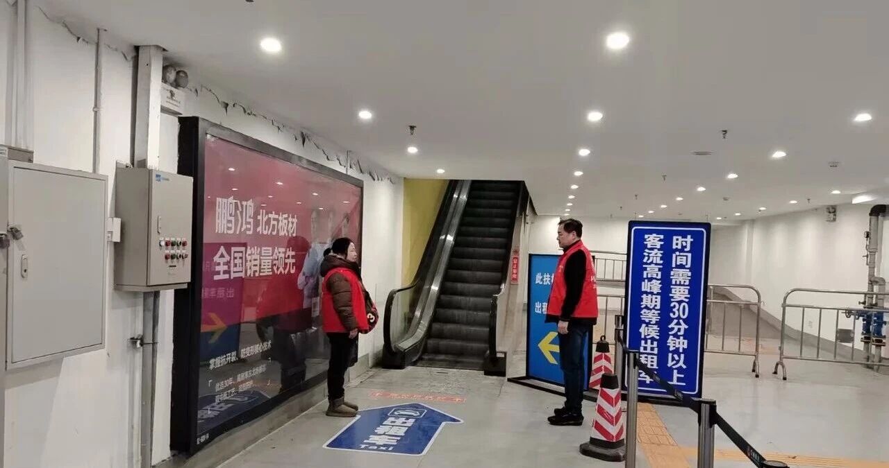 看到行動不便的老人,志愿者們會上前攙扶一把;遇到帶著孩子的母親,他們會幫忙提一提嬰兒車。那一抹抹流動的紅色,像是一根根針線,將秩序與溫情密密地縫進了繁忙的春運畫卷中。